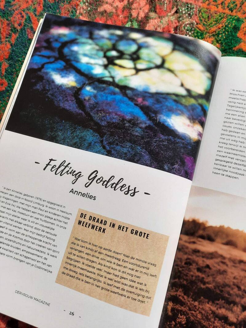Ik heb het zelf mogen schrijven, mijn reportage in Oervrouw Magazine nr. 9, december 2022. Ik geniet van schrijven, de juiste woorden bij mijn beeld- en gevoelswereld te vinden. Te benaderen, wat eigenlijk niet te omschrijven valt omdat woorden soms niet toereikend zijn. Het is een bijzondere ervaring om de woorden die mij zo nabij liggen, de foto's van mezelf en een aantal van mijn creaties, in volle glorie in een magazine te zien.
