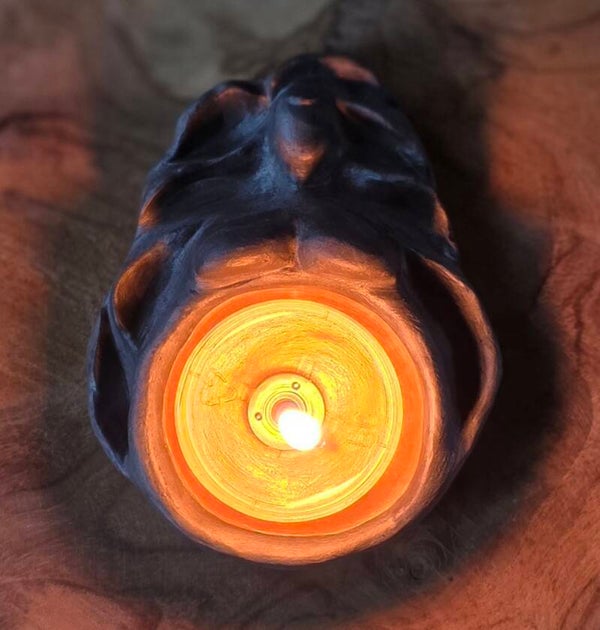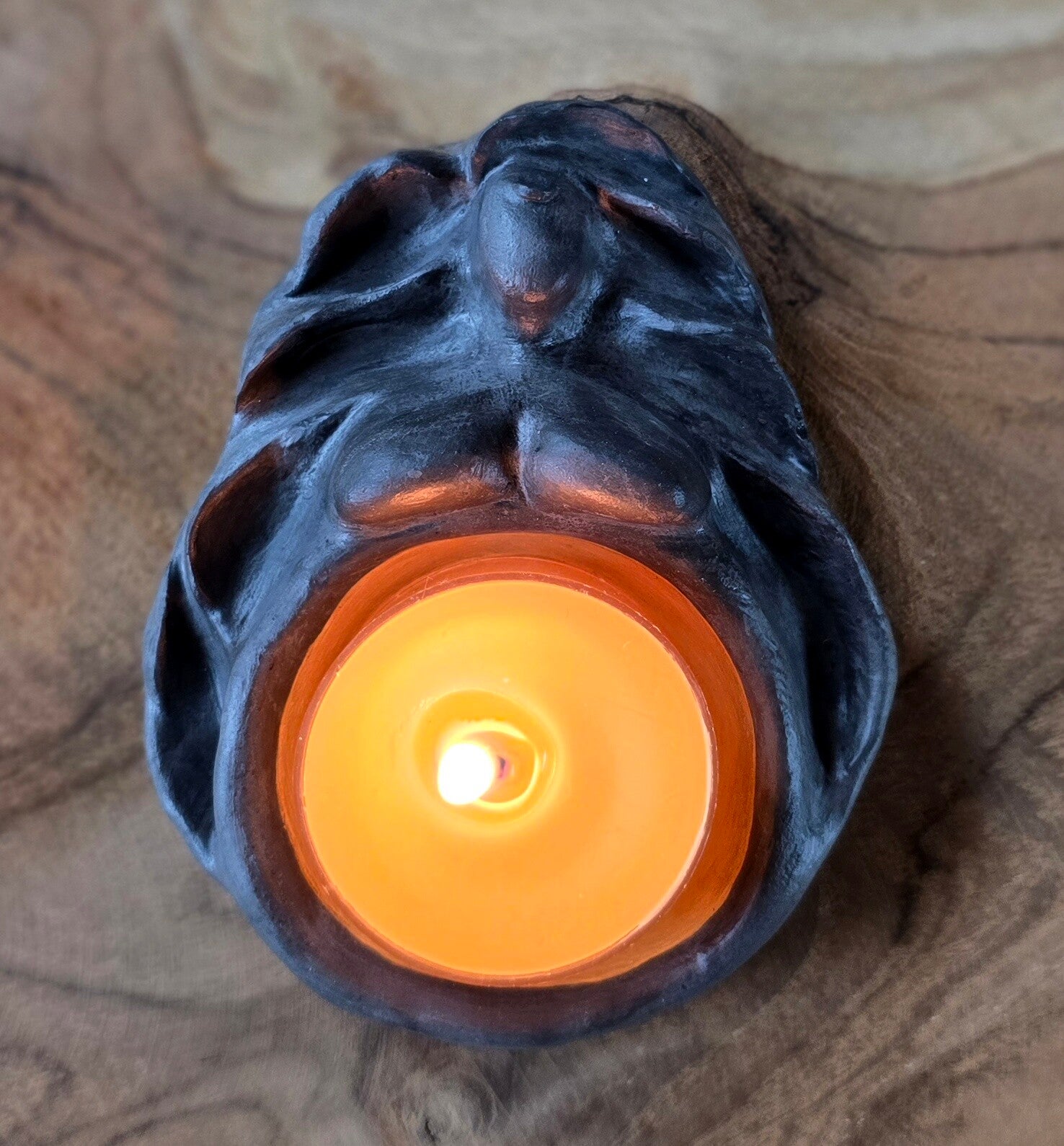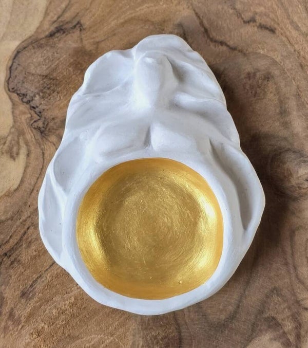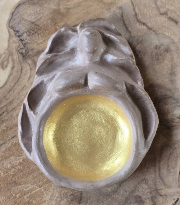 Wanneer je een bijenwas theelichtje in haar buik brand, licht haar goud nóg meer op. Bij elk beeldje geef ik een hand gegoten theelichtje, deze kun je extra bijbestellen.