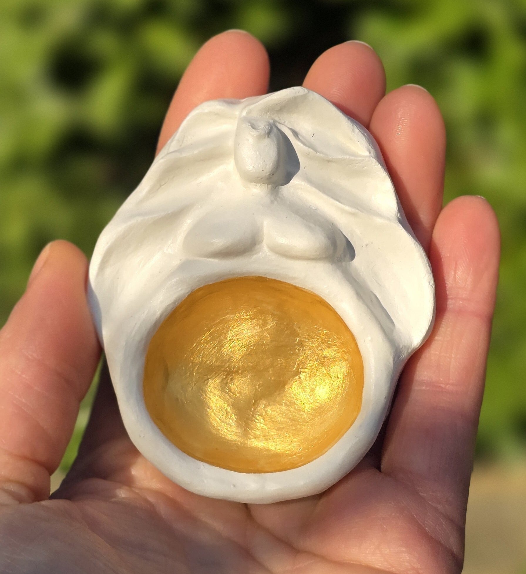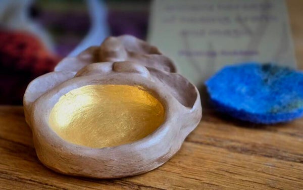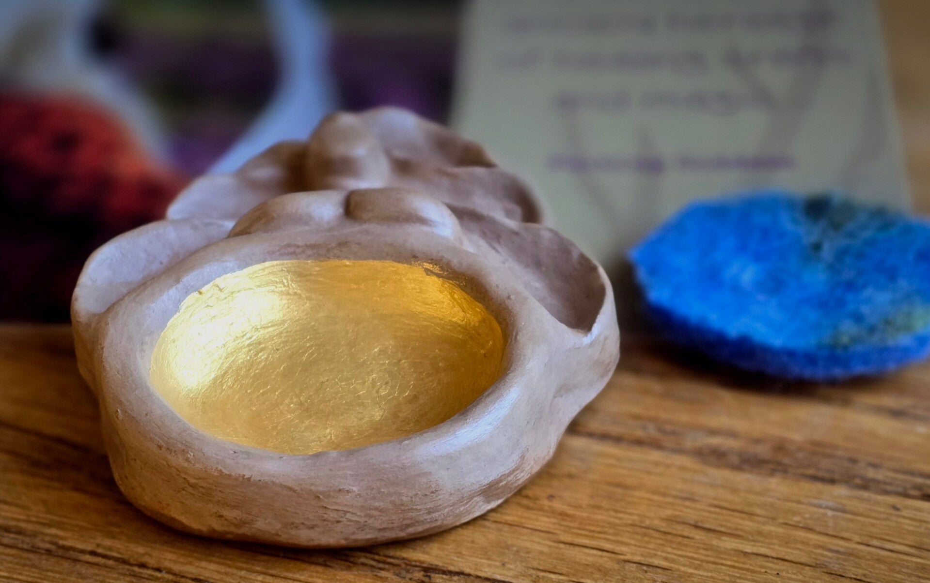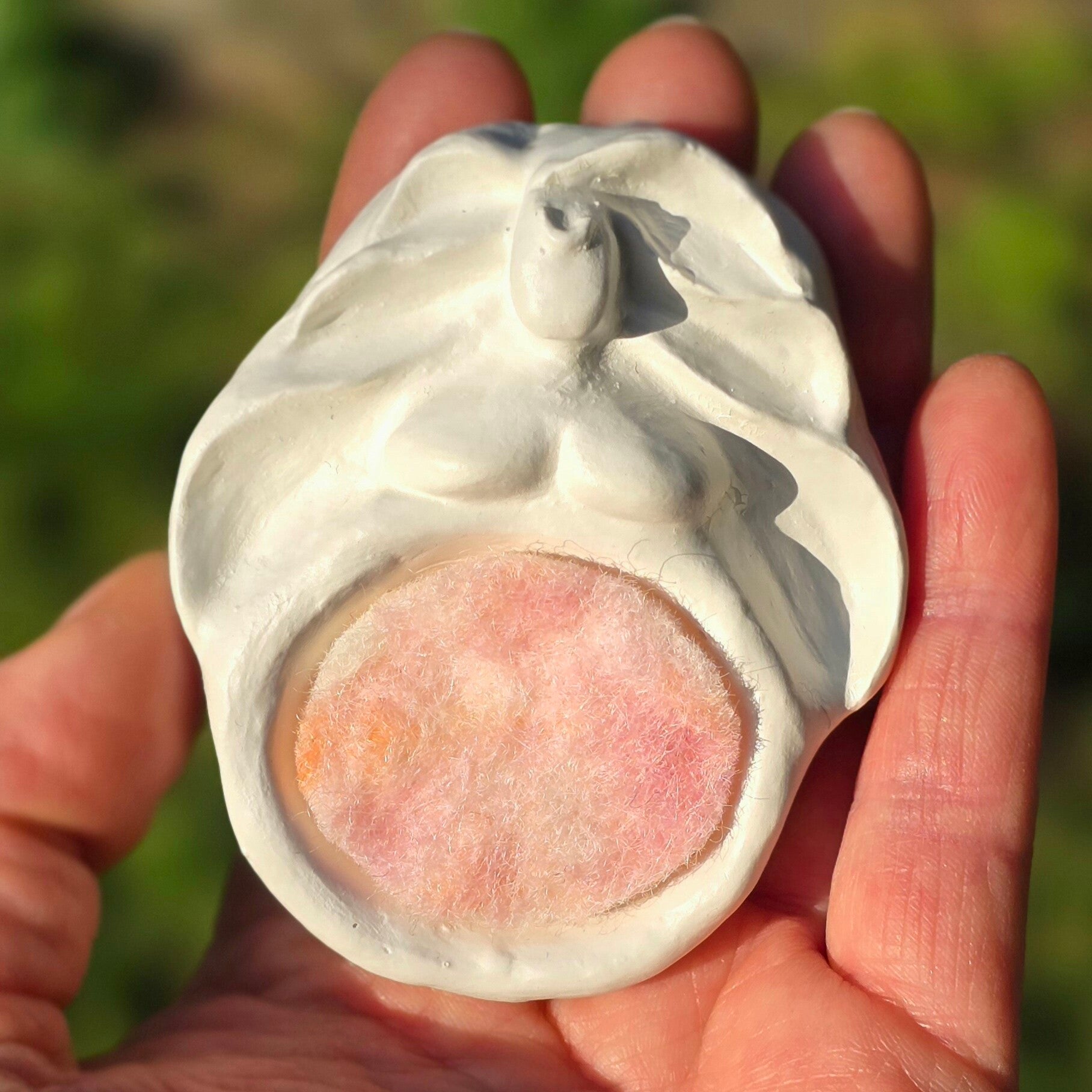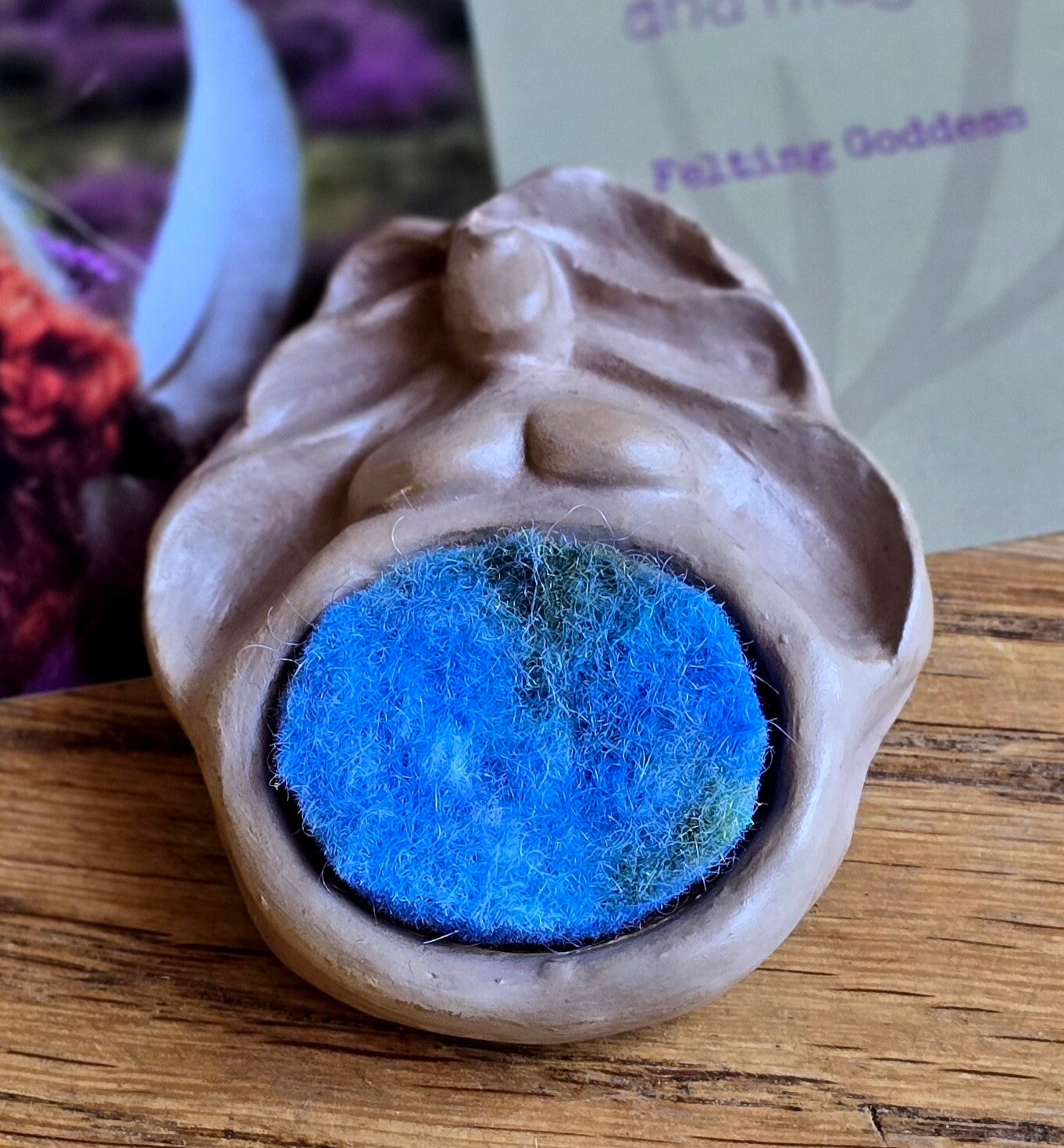Met een zacht handgemaakt wollen viltje dat je in haar gouden buik kunt leggen. Druppel er wat etherische olie op, of leg een schat in de zachte wol.