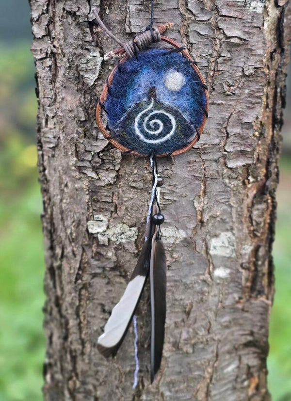 Cirkel - tak van de appelboom in onze tuin, schilderij van schapenwol, 2 veren die ik heb gevonden, waxkoord, houten kralen.