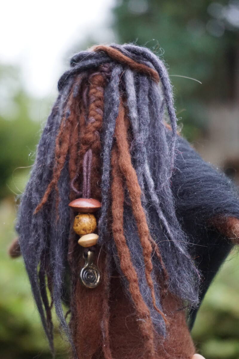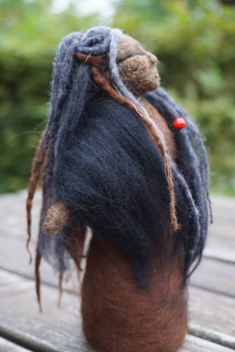 Deze zeer persoonlijke Keeper staat met haar vrouwelijke ancestral wijsheid in het midden, tussen verleden en toekomst. Ons haar bevat DNA. Ik heb mijn eigen haar meegevilt in haar dreads (zulk haar zou ik wel willen) om hiermee verbinding te maken. Ze draagt achter in haar haar ook het haarjuweel dat te zwaar bleek voor mijn eigen haar. Met haar zwarte ogen kijkt zij naar binnen naar de schaduw om aan het licht te brengen in mijn familielijn wat er geheeld mag worden en of er iets is wat tegenhoudt om mijn haar te laten groeien.