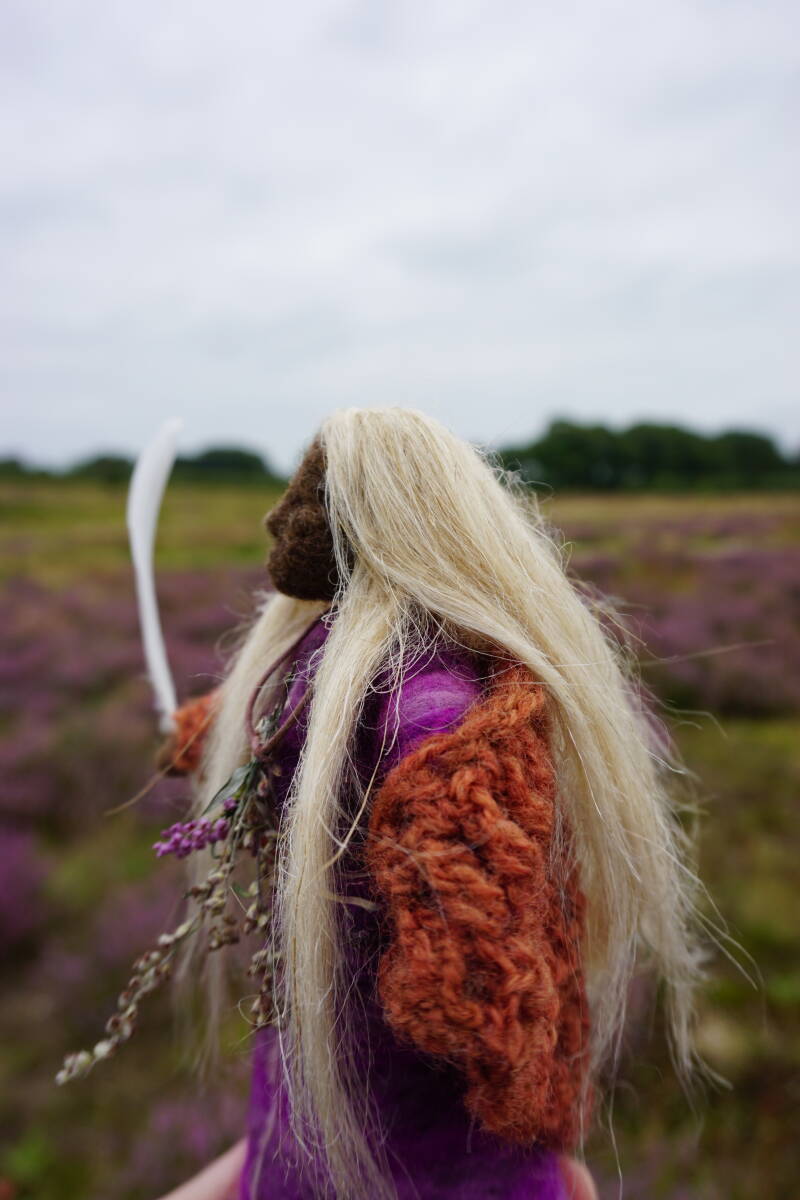 In haar medicine bundle in haar lijf, draagt ze heide uit kamp Westerbork en bijvoet van de hunebed wandeling bij Borger, om donkere krachten buiten en in zichzelf aan te kijken. Met liefde en mededogen zien voor wat het werkelijk is, en daardoor geheeld kan worden. Lavendel uit onze tuin voor zachtheid, compassie en heling. Goudsbloem blaadjes en hart uit onze tuin voor de zonnekracht, liefde en warmte die we jegens elkaar moeten bewaken. We hebben elkaar allemaal nodig, ondanks en dankzij alles. Ze is gemaakt van schapenwol, haar haar van hennepvezels, haar omslagdoek van handgeverfde en handgesponnen wol van een lieve sister. Om haar hals heeft ze bijvoet en heide om te smudgen.